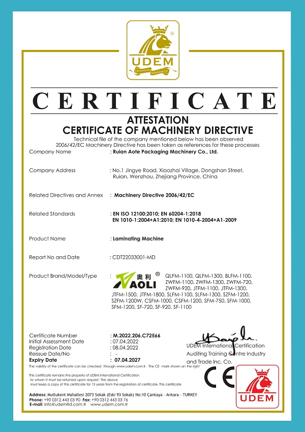 Ruian Aote Packaging Machinery Co., Ltd. Main business: paper machine, laminating machine (vertical laminating machine, water-based laminating machine, non-adhesive laminating machine, pre-coating machine), paper drawing and cutting machine, Optical machine, cover machine